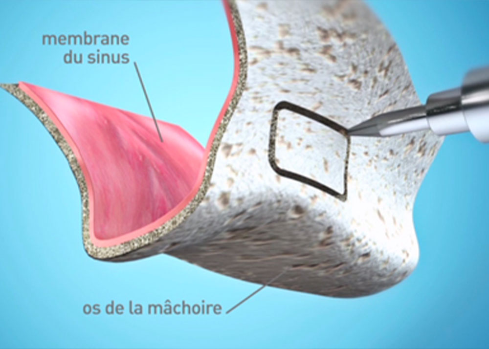 - Soit la hauteur de la crête est inférieure à 6 mm : il est alors nécessaire d’augmenter le volume de la crête osseuse aux dépens du sinus, pour positionner des implants dentaire ayant une longueur plus commune (13mm).